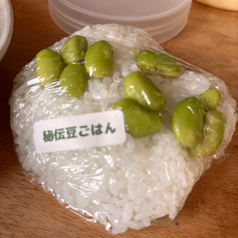 産直広場あぐりっとの香りの良い秘伝豆のおにぎり。幸せな旬のご飯だ。