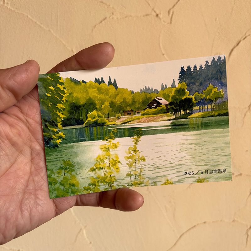 にじみで表現された靄(もや)、スパッタリング(筆で絵の具を弾き、彩り豊かな飛沫を描く手法)で描かれた風に舞う雪、水辺の風景の思いがけない影の色にうっとり。