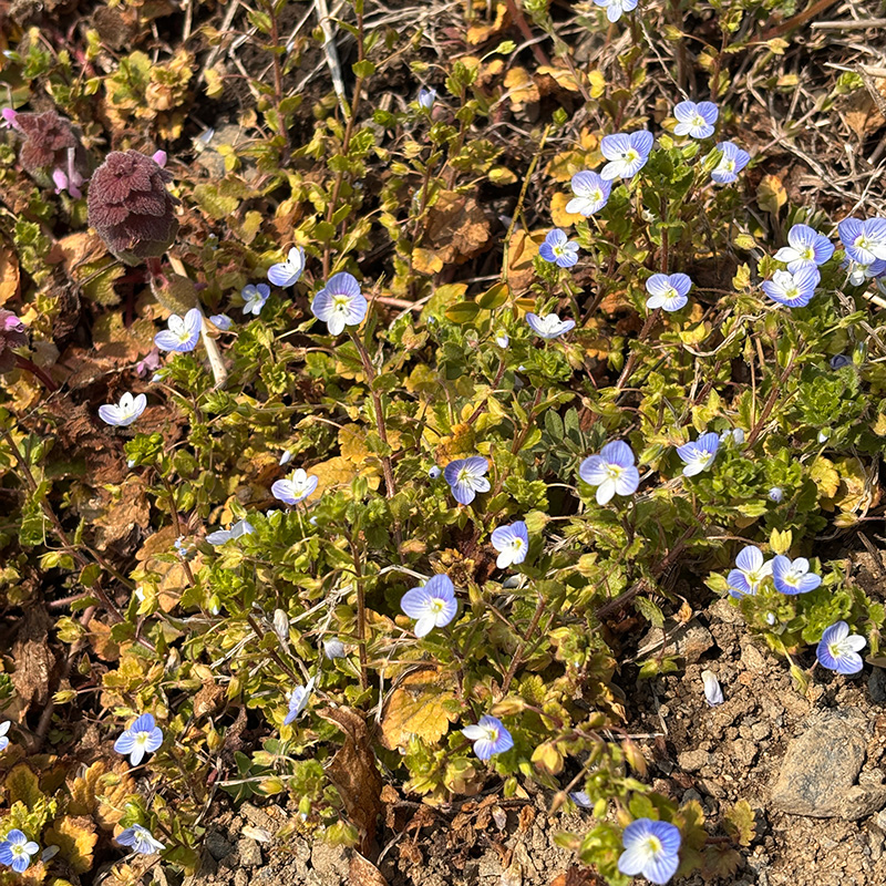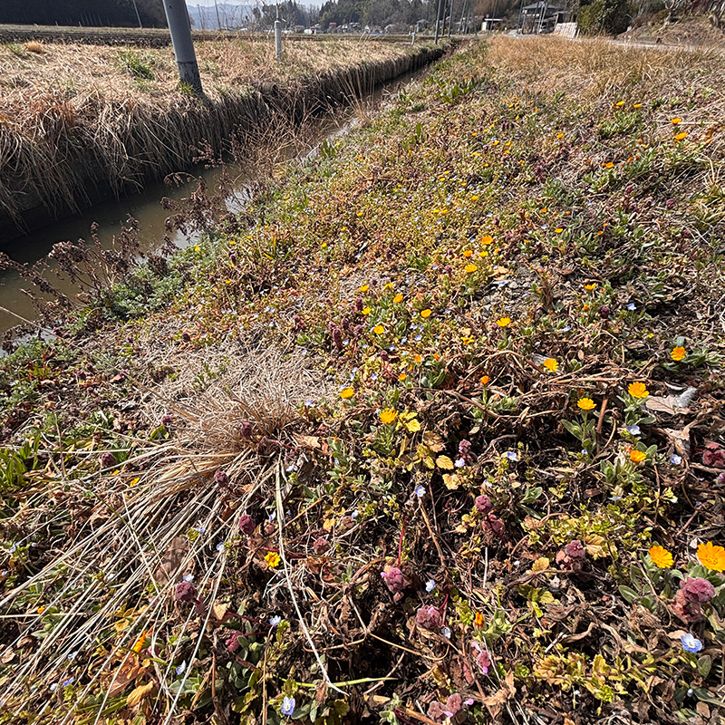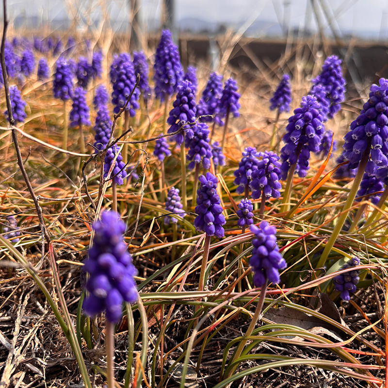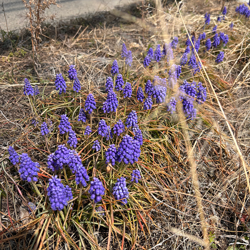 水路脇の土手にムスカリの花が一斉に咲き始めた。
