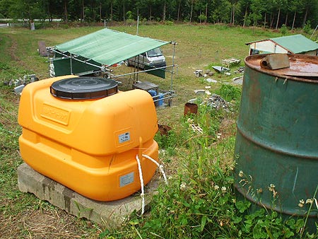 仕事場は山の一角にある。山砂を取った跡地のため平坦で国道に面していてなにかと便利だ。ただ水道が通っていない。飲み水はタンクに入れて持っていくが石を磨くのに必要な水は仕事場の一番高い位置に置いたドラム缶にためて高低差を利用して出していた。今日、メンテナンスの楽なプラスチックのものを導入。