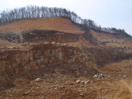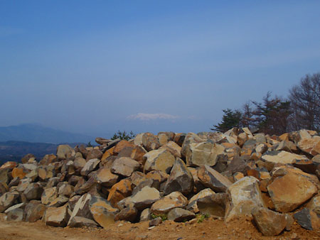 写真、上左あたりがイサムノグチの石を採ったエリアだという。その下の山砂に埋もれた伊達冠石の岩盤。うっとり。山田社長はこのままを、そっくりそっと掘り出したいと考えているという。技術的には大変だろうけどこのまま都会のレストランなどの壁面に再現したら素晴らしい壁面になるだろう。一部を磨いたり抜いたりして。